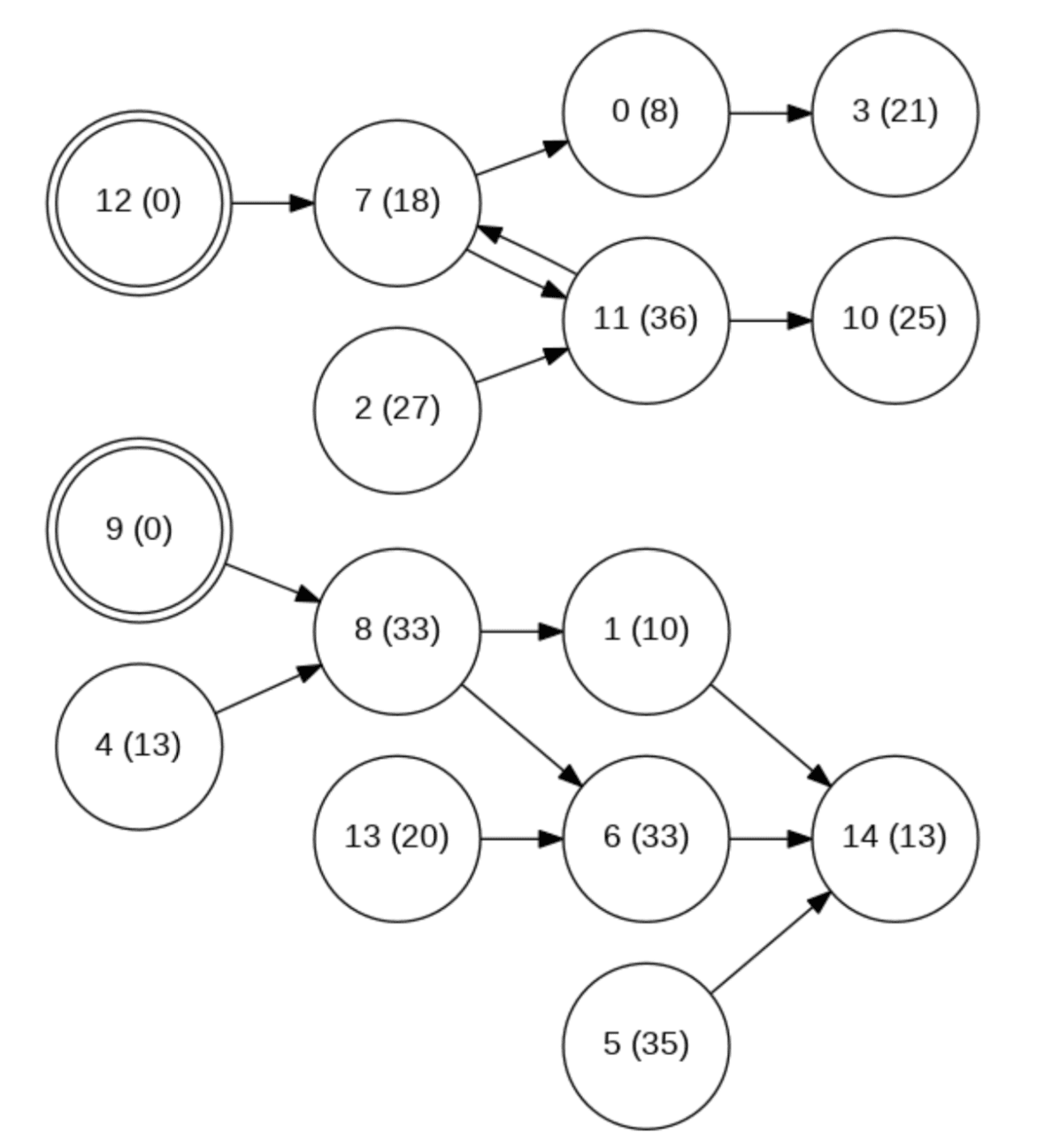 Following that are lines with tuples where , each of which denotes a pair of object indices. A tuple means that object stores a reference to object , keeping it "alive" provided that is reachable from a root.