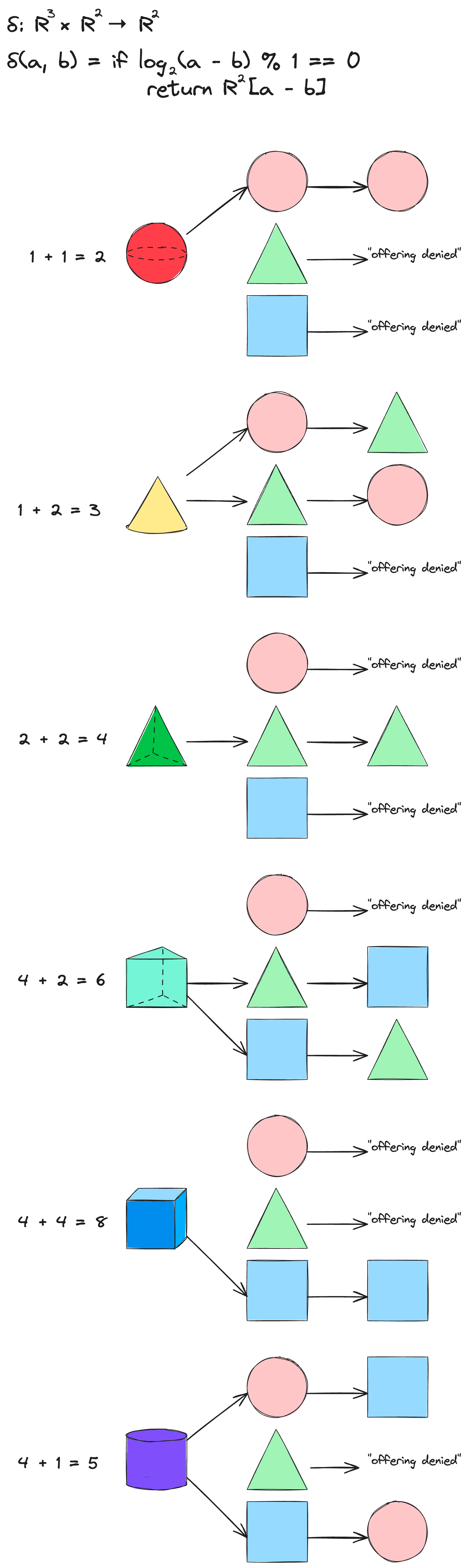 Now, my notation thus far has been perverse if not outright misleading. Reasoning about how the shapes are combined via "multiplicative" dunking and "divisive" dissection is straightforward enough without the above explication. The rub of the puzzle as it's presented is that these functions and are not pure. The act of dissection carries a stateful "swap" which must be implicitly tracked by guardians during the trial.